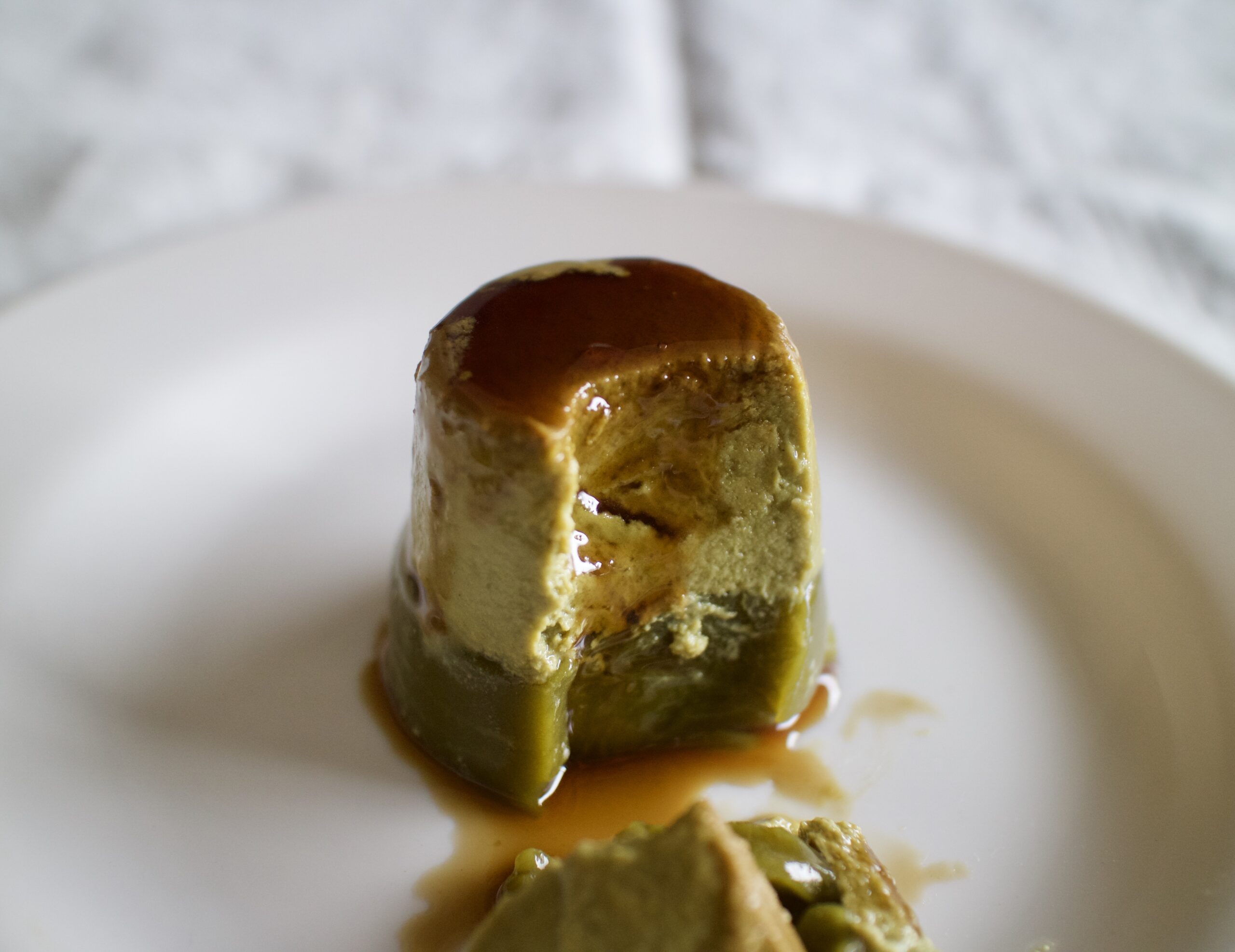 そしてプリンが、今回は何と初の2層式!プリンカップの下の層が、緑茶のベイクドプリン、上の層が緑茶のゼリー。