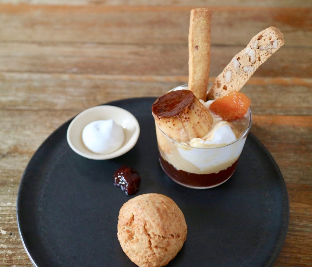 hoco’s special parfait plate✨ Creme caramel, Raw sugar& walnuts ice cream, Yogurt sherbet, Banana jam, Granola, Japanese organic black tea jelly, Cream Chantilly, Apricot Comport, Corn meal cookie and Original Biscotti. Everything is homemade